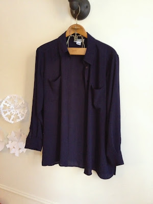 Enough of the pep talk, and down to business. I burned myself out a bit doing an "all homemade and thrifted" Christmas for my family. Don't get me wrong, I loved doing it and I'm glad that I did. Lack of funds truly helped breed creativity! But, once I'd finished everything up, I didn't want to have anything to do with my sewing machine or notions. So, I took a couple of weeks off. As I was browsing through my "refashion ideas" board on Pinterest, I came across a copycat that I wanted to make of the Beckett Buttondown (no longer available) from Anthropologie. I had the perfect navy blue thrifted top sitting in my stash, so I figured, what the heck. Let's see if I've got my mojo back...here's how it went down.