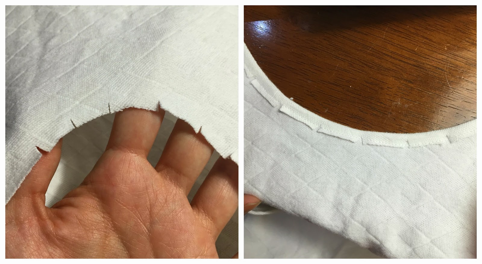Next I cut small slits into the neckline, folded it over once and stitched it down. I also folded the armhole edges over once and stitched down to finish off.
